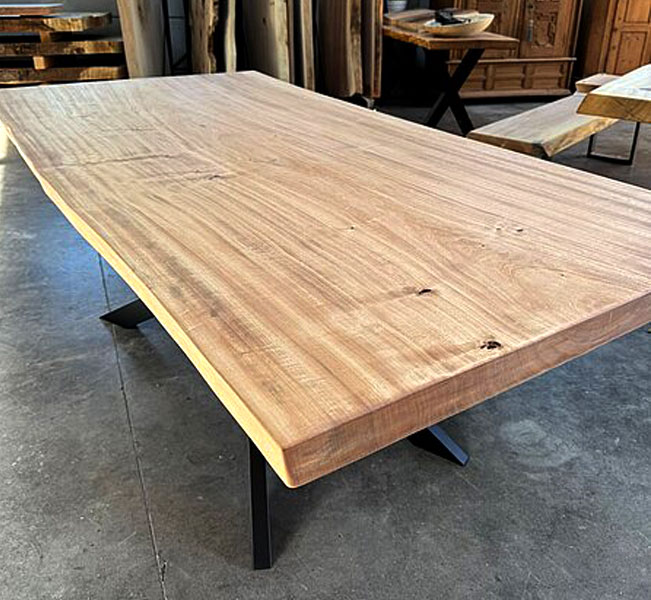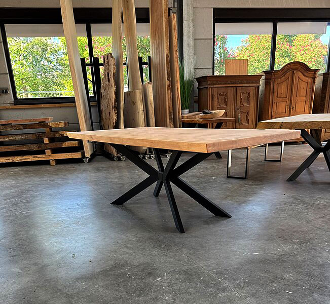 Exklusiver Baumkantentisch mit den Maßen 240 x 100 x 6 cm aus einem Stück gefertigt - kein Leimholz. Mit Kreuzgestell schwarz. Dieser einzigartige Tisch bringt Generationen zusammen. Andere Maße vorrätig